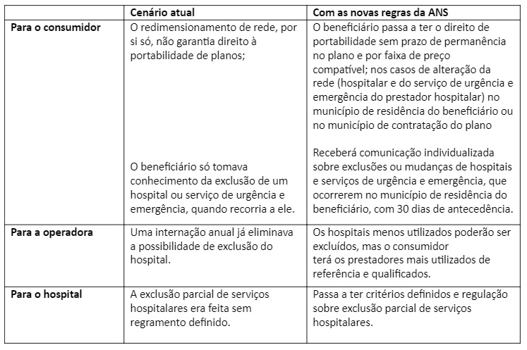 Em relação à redução de rede hospitalar, uma das principais mudanças está relacionada à análise do impacto sobre os consumidores atendidos pela operadora. De acordo com a regra atual, observa-se a quantidade de internações realizadas no intervalo de 12 meses. Ou seja, se o hospital em questão não registrar internações de beneficiários no período de 12 meses, o estabelecimento pode ser excluído pela operadora.