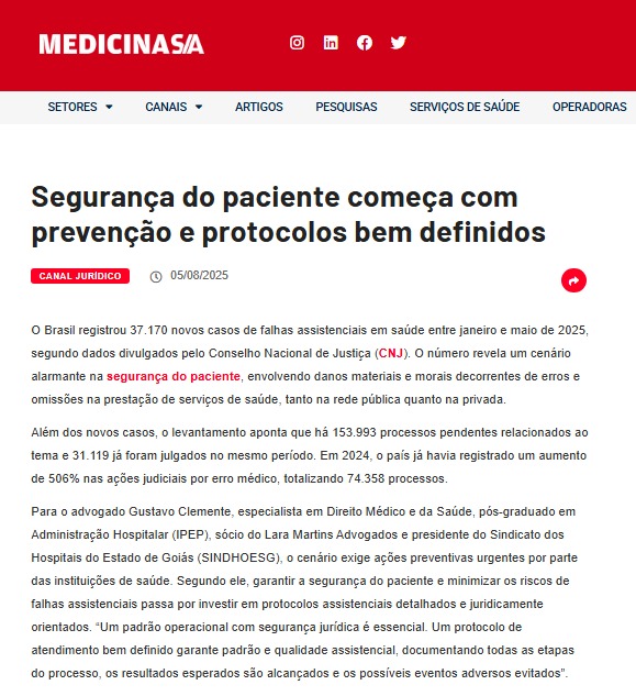 Para o advogado Gustavo Clemente, especialista em Direito Médico e da Saúde, pós-graduado em Administração Hospitalar (IPEP), sócio do Lara Martins Advogados e presidente do Sindicato dos Hospitais do Estado de Goiás (SINDHOESG), o cenário exige ações preventivas urgentes por parte das instituições de saúde. Segundo ele, garantir a segurança do paciente e minimizar os riscos de falhas assistenciais passa por investir em protocolos assistenciais detalhados e juridicamente orientados. “Um padrão operacional com segurança jurídica é essencial. Um protocolo de atendimento bem definido garante padrão e qualidade assistencial, documentando todas as etapas do processo, os resultados esperados são alcançados e os possíveis eventos adversos evitados”.