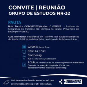 NOTÍCIAS Grupo de Estudos da NR-32 do Sindhoeg debateu a segurança dos pacientes Leia mais » 25 de setembro de 2023