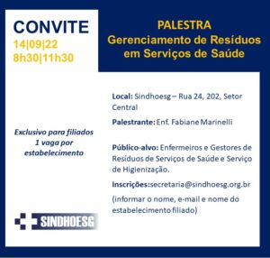 NOTÍCIAS Nova palestra de capacitação do Sindhoesg vai abordar o Gerenciamento de Resíduos em Serviços de Saúde Leia mais » 12 de setembro de 2022