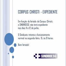 NOTÍCIAS Corpus Christi – Confira como será o expediente no Sindhoesg Leia mais » 10 de junho de 2020