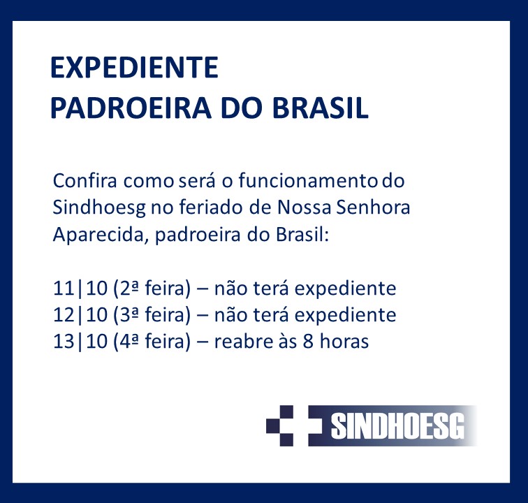 Devido ao feriado de Nossa Senhora Aparecida, padroeira do Brasil, celebrado no dia 12, o expediente no Sindhoesg será alterado no início da próxima semana. Confira: