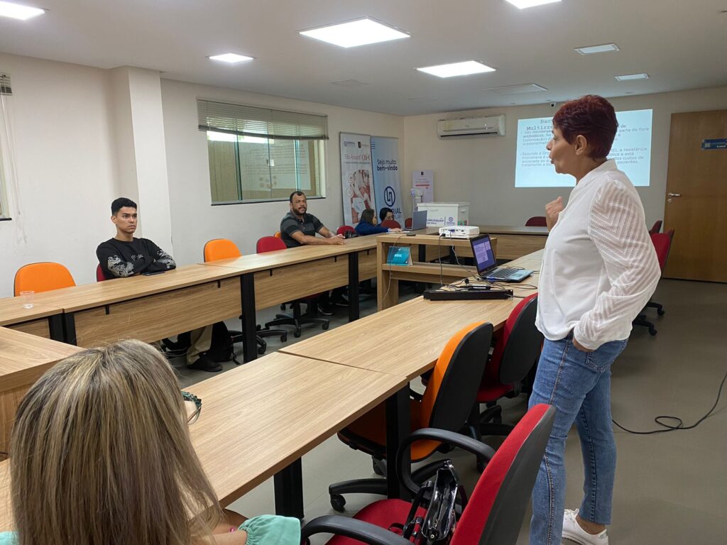 Ela relembrou os cinco momentos de higienização e alertou os participantes sobre cuidados com a higienização após contato com superfícies, como maçanetas, teclados e telas de computadores e interruptores de luz.