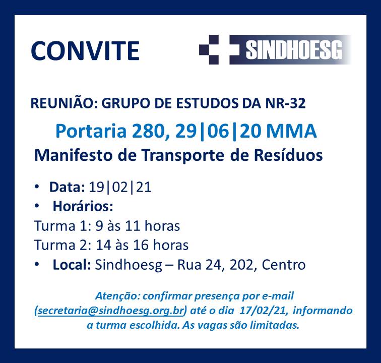 A próxima reunião do Grupo de Estudos da NR-32, do Sindhoesg, já tem data marcada: na sexta-feira, 19 de fevereiro. O encontro será presencial, na sede do Sindicato, e com duas turmas disponibilizadas: no período matutino, das 9 às 11 horas, e no vespertino, das 14 às 16 horas.