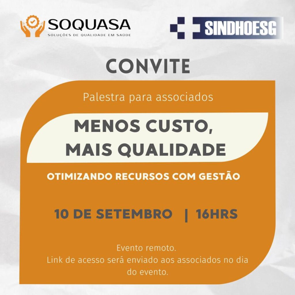 O Sindhoesg e a SOQUASA (Soluções de Qualidade em Saúde) convidam os filiados para a palestra “Menos Custo, Mais Qualidade: Otimizando Recursos com Gestão”, que será ministrada no dia 10 de setembro, no formato online.