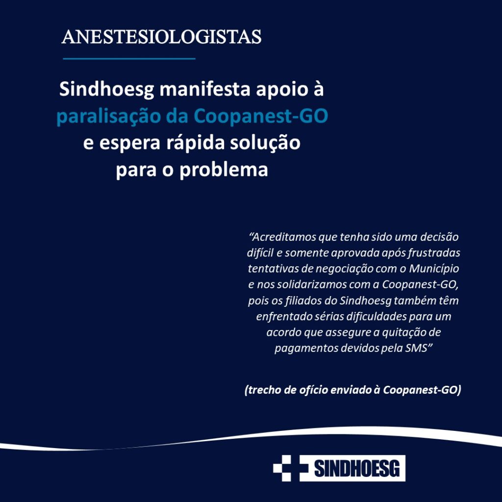 “Acreditamos que tenha sido uma decisão difícil e somente aprovada após frustradas tentativas de negociação com o Município e nos solidarizamos com a Coopanest-GO, pois os filiados do Sindhoesg também têm enfrentado sérias dificuldades para um acordo que assegure a quitação de pagamentos devidos pela SMS”.
