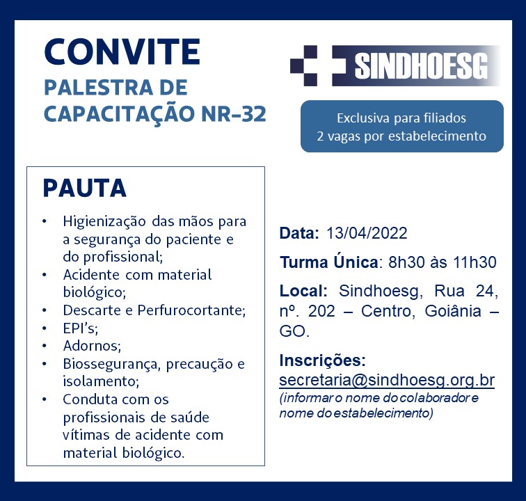 O Sindhoesg convida os técnicos e auxiliares de enfermagem dos estabelecimentos filiados para a Palestra de Capacitação sobre a NR-32, que será realizada no dia 13 de abril, em turma única, das 8h30 às 11h30, na sede do Sindicato – Rua 24, 202, Centro.