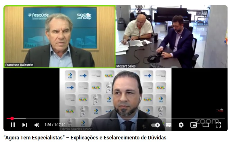 Com o apoio do Sindhoesg, o Sindhosp e a Fesaúde promoveram ontem, 16, um webinar sobre o recém-criado programa “Agora Tem Especialistas”. O evento, que integra o projeto “Diálogos da Saúde”, teve a moderação do presidente do Sindhosp e da Fesaúde, Francisco Balestrin, e contou com a participação do secretário de Atenção Especializada à Saúde, Mozart Sales, do diretor do Departamento de Estratégias para Expansão da Atenção Especializada, Rodrigo Oliveira, e do Diretor do Fundo Nacional de Saúde, Dárcio Guedes Junior.